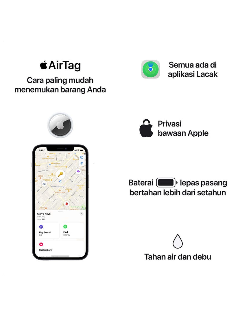 AirTag. Lacak lokasi kunci, dompet, koper, ransel Anda, dan banyak lagi, melalui aplikasi Lacak. Bunyikan suara di speaker bawaan untuk membantu menemukan AirTag Anda yang ada di sekitar. Jika lokasinya jauh, ratusan juta perangkat Apple di jaringan Lacak bisa membantu melacaknya. Semuanya secara anonim dan dienkripsi untuk perlindungan privasi.