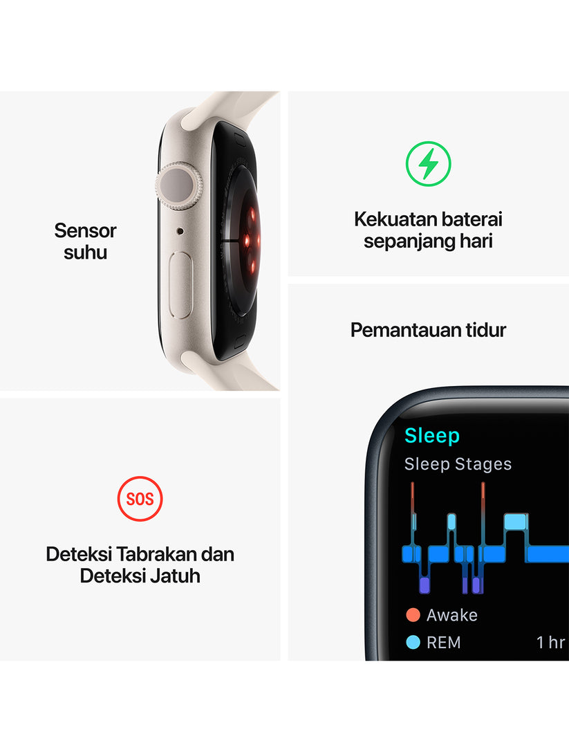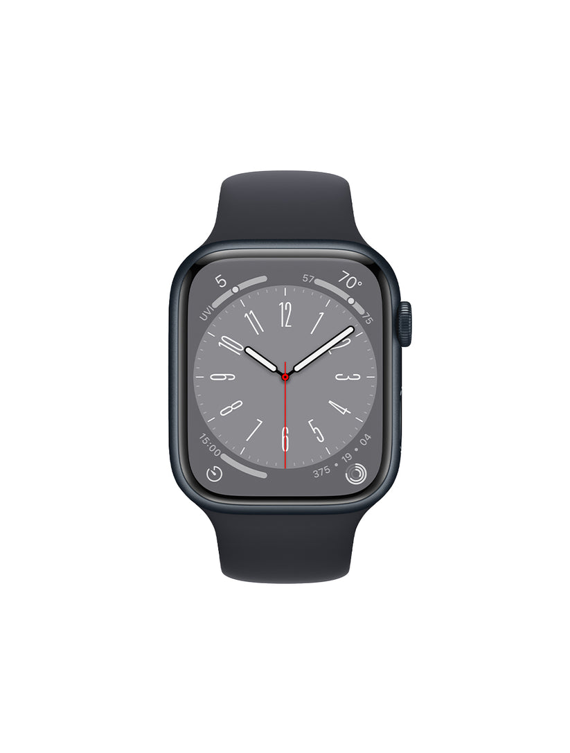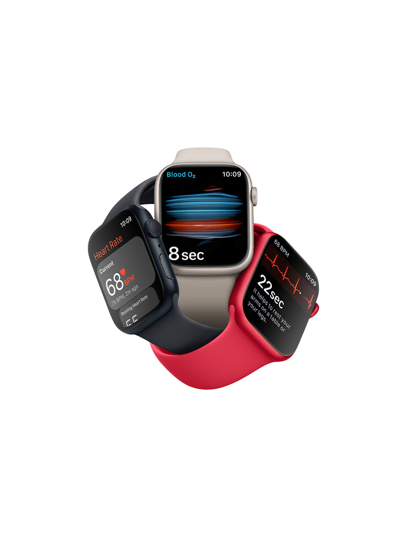 Apple Watch Series 8 includes advanced health apps and sensors, so you can take EKG measurements (1), heart rate, and blood oxygen levels (2), and monitor temperature changes (3) for in-depth information about your menstrual cycle (4). And with Collision Detection, sleep stage monitoring, and advanced exercise metrics, Apple Watch Series 8 helps you stay active, healthy, safe, and connected.