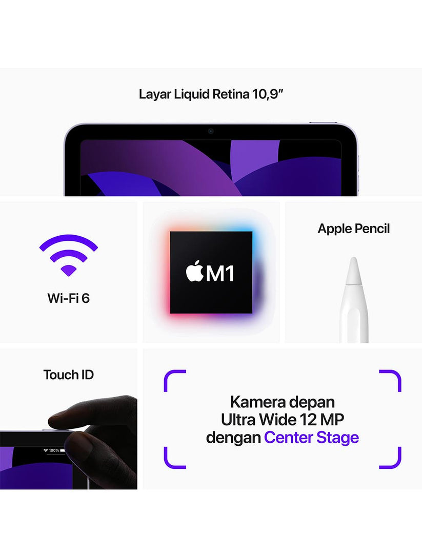 iPad Air. Dengan layar Liquid Retina 10,9 inci yang menghanyutkan.1 Terobosan chip Apple M1 menghadirkan performa yang lebih cepat, membuat iPad Air begitu bertenaga untuk berkreasi dan bermain game. Dilengkapi Touch ID, kamera canggih, nirkabel secepat kilat, USB-C, dan dukungan untuk Magic Keyboard dan Apple Pencil (generasi ke-2)