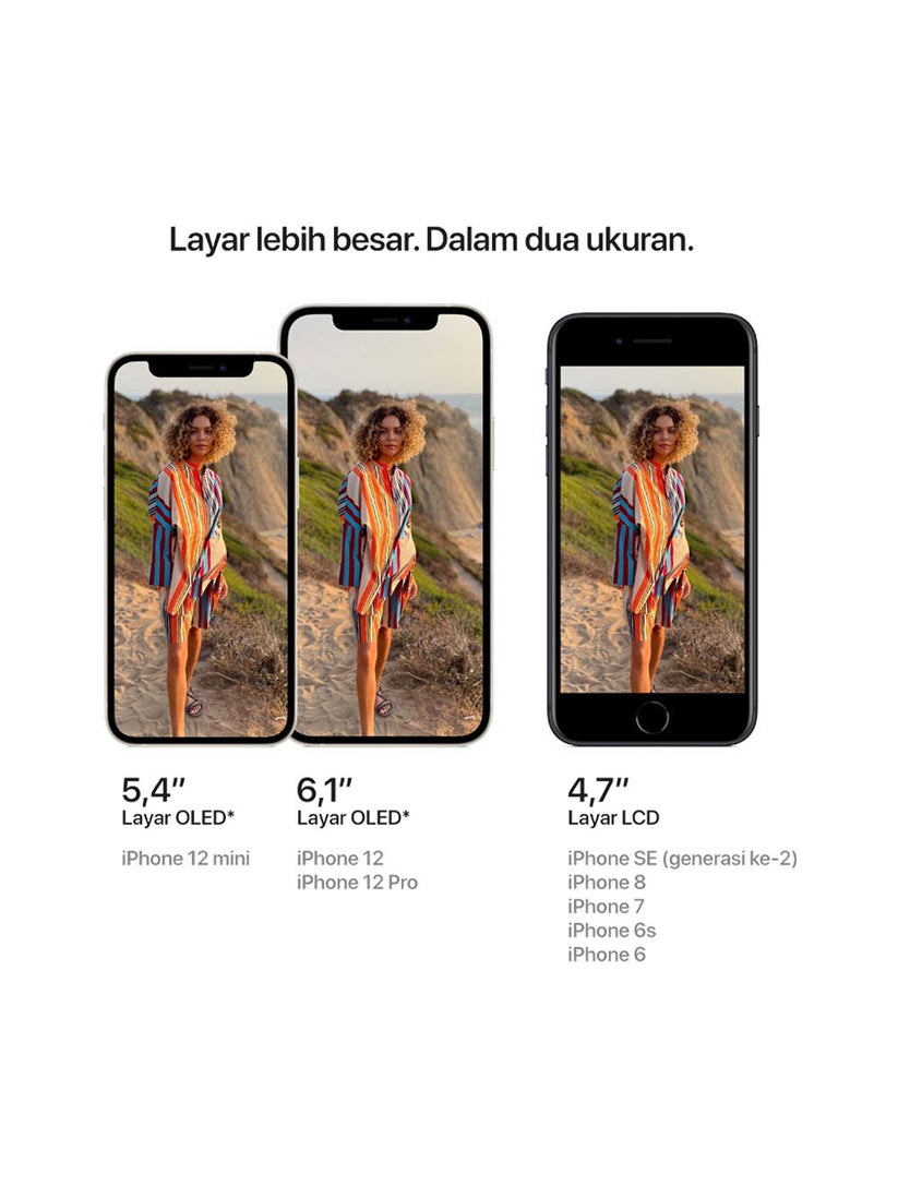 iPhone 12. Layar Super Retina XDR 6,1 inci yang begitu cerah.(1) Ceramic Shield dengan ketahanan jatuh empat kali lebih baik.(2) Fotografi pencahayaan rendah yang menakjubkan dengan mode Malam di semua kamera. Mampu merekam, mengedit, dan memutar video sekelas sinema dengan Dolby Vision. Chip A14 Bionic yang andal. Dan aksesori MagSafe baru untuk kemudahan pemasangan dan pengisian daya nirkabel yang lebih cepat.(3) Saatnya bersenang-senang.