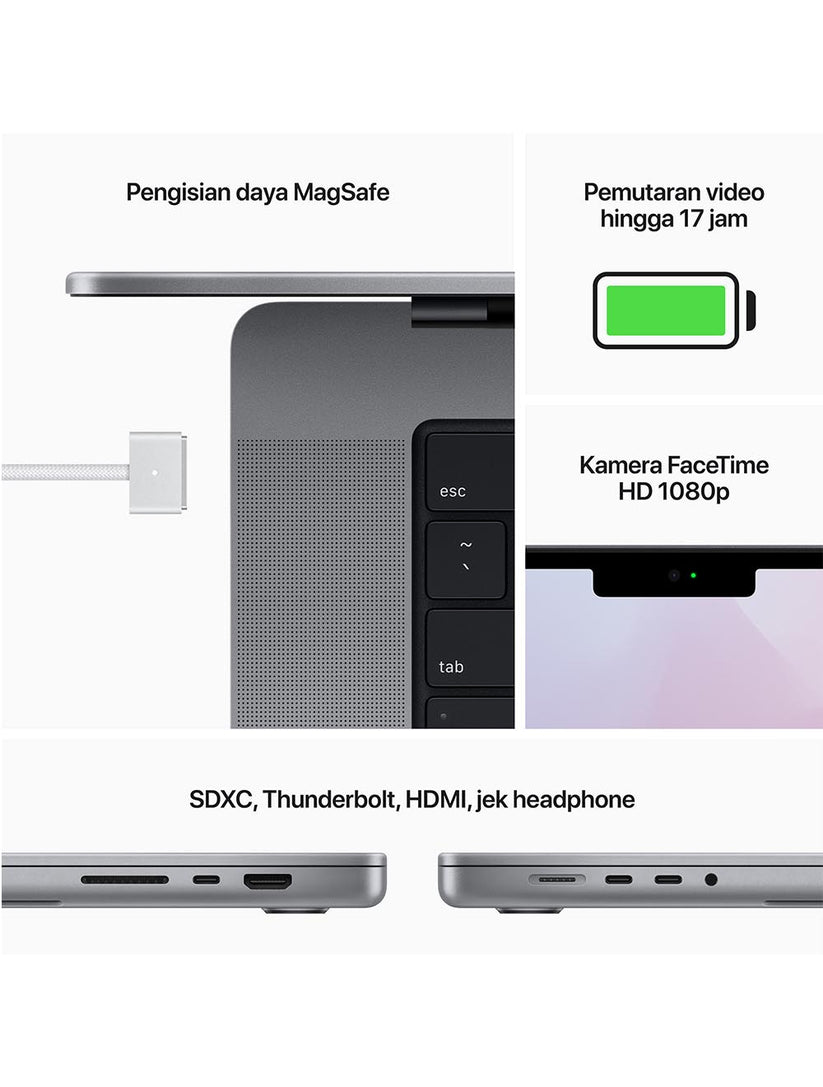 * Tigaport Thunderbolt 4, port HDMI, slot kartu SDXC, jek headphone, port MagSafe 3